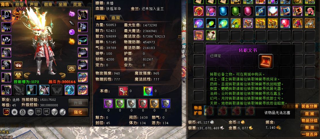 【法师 男 角色等级45 可以二次实名 】45级法师带转职卡,带7140绑金,具体看图