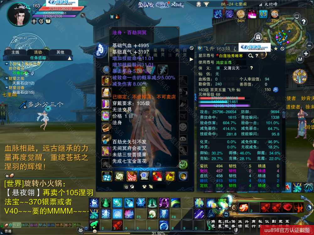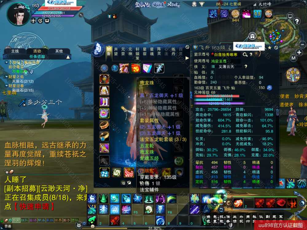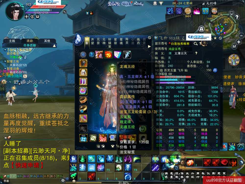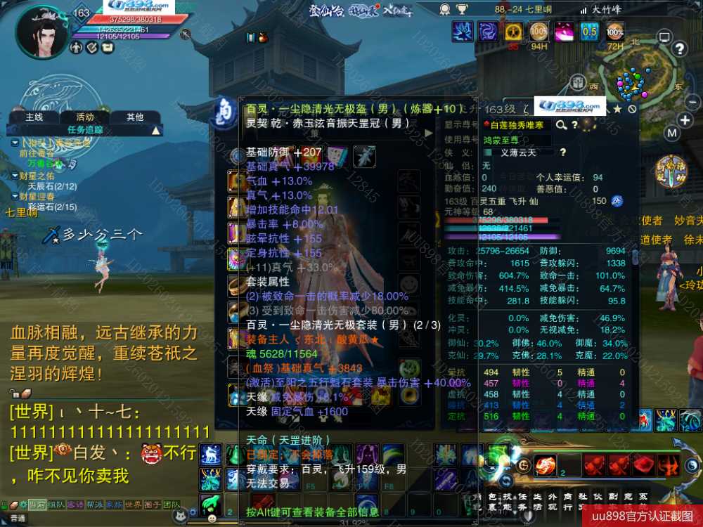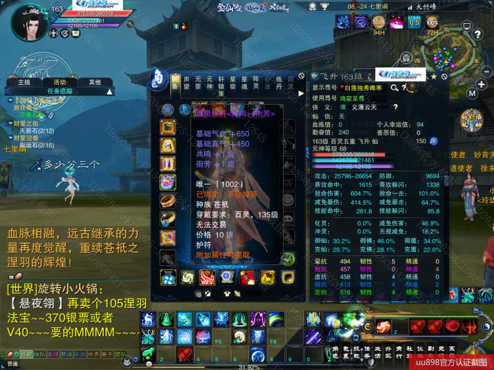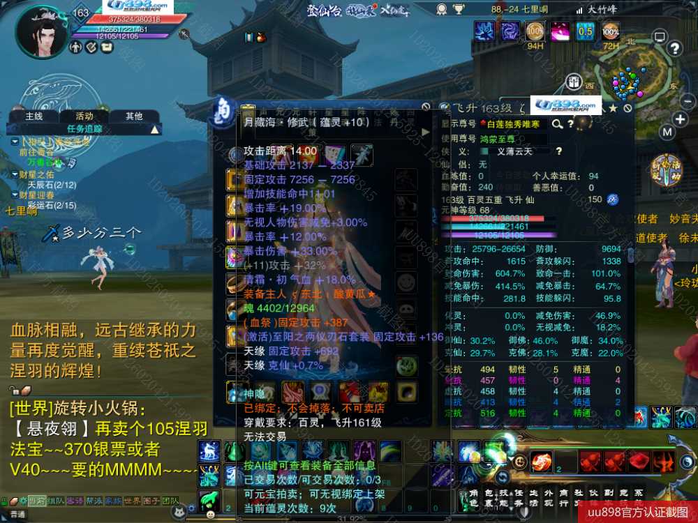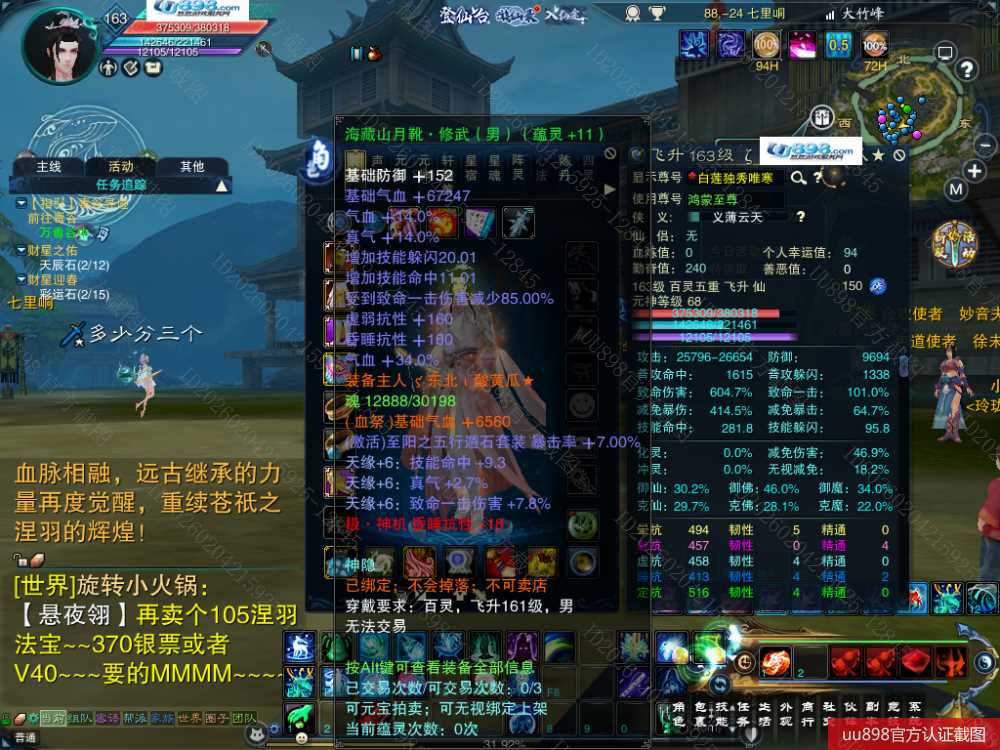 【百灵 五重修真 男 角色等级163 仙 苍祇 】7阵都12阶,天罡10的头,修武10的武器,11的鞋子,11衣服,包里还有10张凤羽,16星宝宝,能单刷T10和小云渺