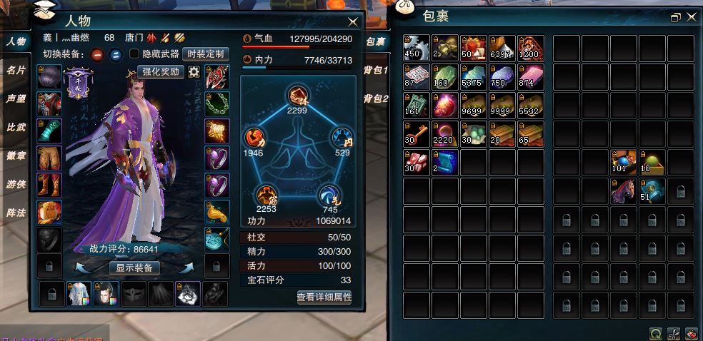 【一个月内,找回包赔】【帐号出售 唐门 男 角色等级68 江湖令剩余天数0 】合服材料都在包裹,用完可以直接上11W战,很划算