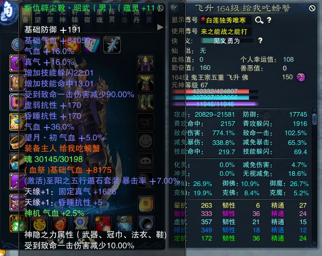 【一个月内,找回包赔】【鬼王 五重修真 男 角色等级164 佛 人族 】昭武11鞋子。7孔阵灵。积分罡气,护符。百法。11佩章。