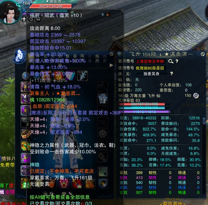 【一个月内,找回包赔】【万毒 五重修真 男 角色等级164 仙 神裔 】出164万毒,昭武武器+10马上11昭武鞋+10昭武腰带也有带20帽子碎片,打本毫无压力